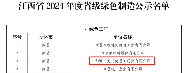 克日,江西省工业和信息化厅宣布了江西省2024年度绿色制造系统名单,vwin德赢网页版(南昌)药业有限公司获评“省级绿色工厂”。